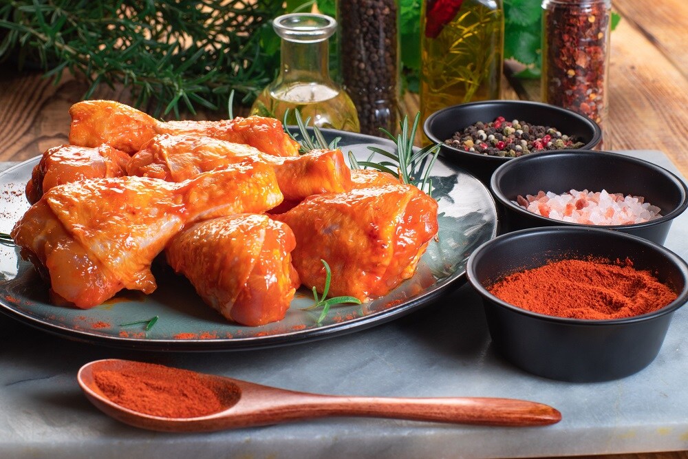 Pentru marinarea umeda a carnii de pui, ai nevoie de o substanta acida, cum ar fi sucul de la o lamaie/limeta sau de la portocala ori otetul, si de un pic de grasime, precum uleiul, bucatelele de bacon sau nucile. Enzimele sunt importante si, pentru carnea de pui, poti opta pentru iaurt, miere, lapte sau suc de ananas. La toate acestea, desigur, nu uita de condimentele uscate sau proaspete, precum rozmarin, turmeric, piper, boia dulce sau iute.
