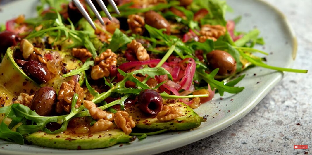 - Pune dovleceii pe un pat de rucola și adaugă amestecul de ceapă și stafide, alături de nuci.
