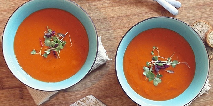 Mod de preparare: pune rosiile la fiert intr-un vas cu apa si sare pana cand coaja acestora incepe sa se desprinda. Curata si cartoful de coaja si lasa-l la fiert pana cand poti infige scobitoarea in el cu usurinta. Dupa ce legumele sunt gata, taie-le cubulete si amesteca-le cu toate celelalte ingrediente in blender (o alta optiune ar fi sa folosesti un mixer vertical). Daca textura supei este prea groasa, o poti subtia cu o jumatate de cana de stock de legume ramas de la cele care au fiert.