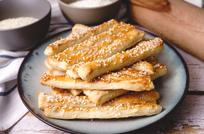 Întinde aluatul de foietaj pe masă și unge-l cu oul bătut. Presară deasupra sare, susan și mac, apoi taie fâșii de un centimetru lățime. Pune fâșiile rezultate pe o tavă cu hârtie de copt și dă-le la cuptor pentru 10-15 minute, până când se rumenesc.