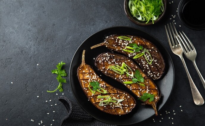 Prăjește susanul într-o tigaie întinsă și lasă-l să se rumenească. Spală și curăță vinetele și taie-le în fâșii longitudinale. Încinge o tigaie cu ulei și pune feliile de vinete la prăjit cu usturoi. Setează cuptorul la 200 de grade și așază feliile de vinete pe o tavă. Adaugă sare pe deasupra și lasă-le 10 minute la cuptor. Amestecă smântâna cu iaurtul, 2-3 căței de usturoi și ⅔ din cantitatea de susan. După gust, adaugă sare, piper și zeamă de lămâie. Servește sosul pe lângă vinetele coapte sau în boluri mici, separate.