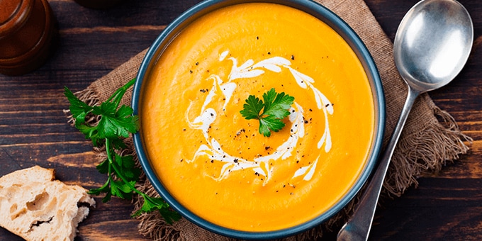 - Poti sa servesti supa de dovleac alaturi de bacon, cateva frunze de busuioc si crutoane.