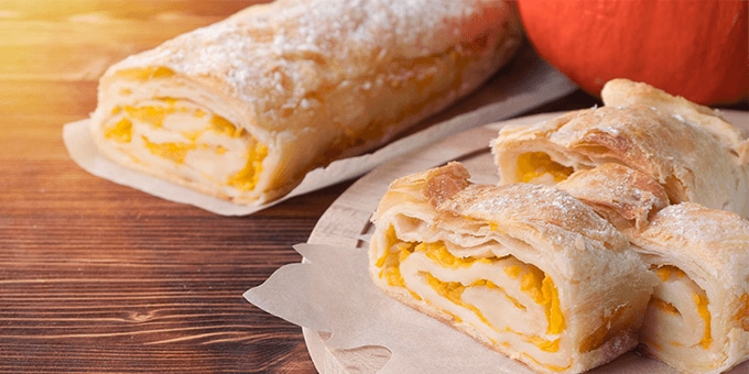 - Adauga apoi jumatate din compozitia de dovleac peste foi , pliaza capetele si formeaza un rulou. Fa apoi si cel de-al doilea rulou.