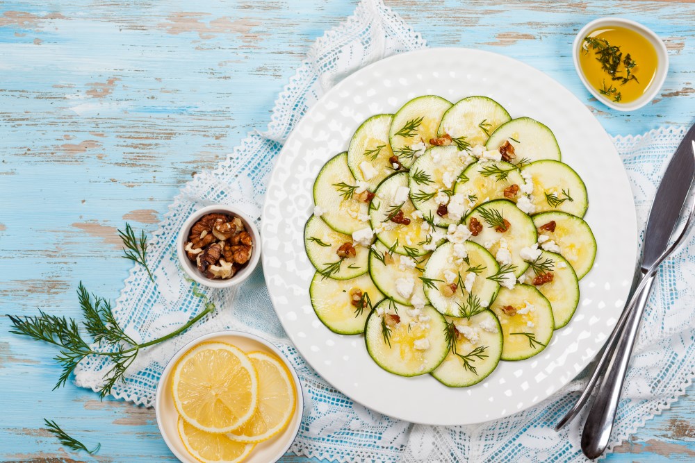 Mod de preparare: Spală bine dovlecelul verde. Taie-l felii subțiri folosind o mandolină. Aranjează feliile subțiri pe farfurie. Presară carpaccio mărar tocat fin, roșii uscate tăiate mic și feta zdrobită. Amestecă uleiul de rapiță cu zeama de lămâie, sare și piper după gust, apoi stropește carpaccio cu acest sos. Pentru un strop de aventură, servește acest carpaccio de dovlecei, atât de sănătos, cu o porție de cartofi copți. Este un deliciu!