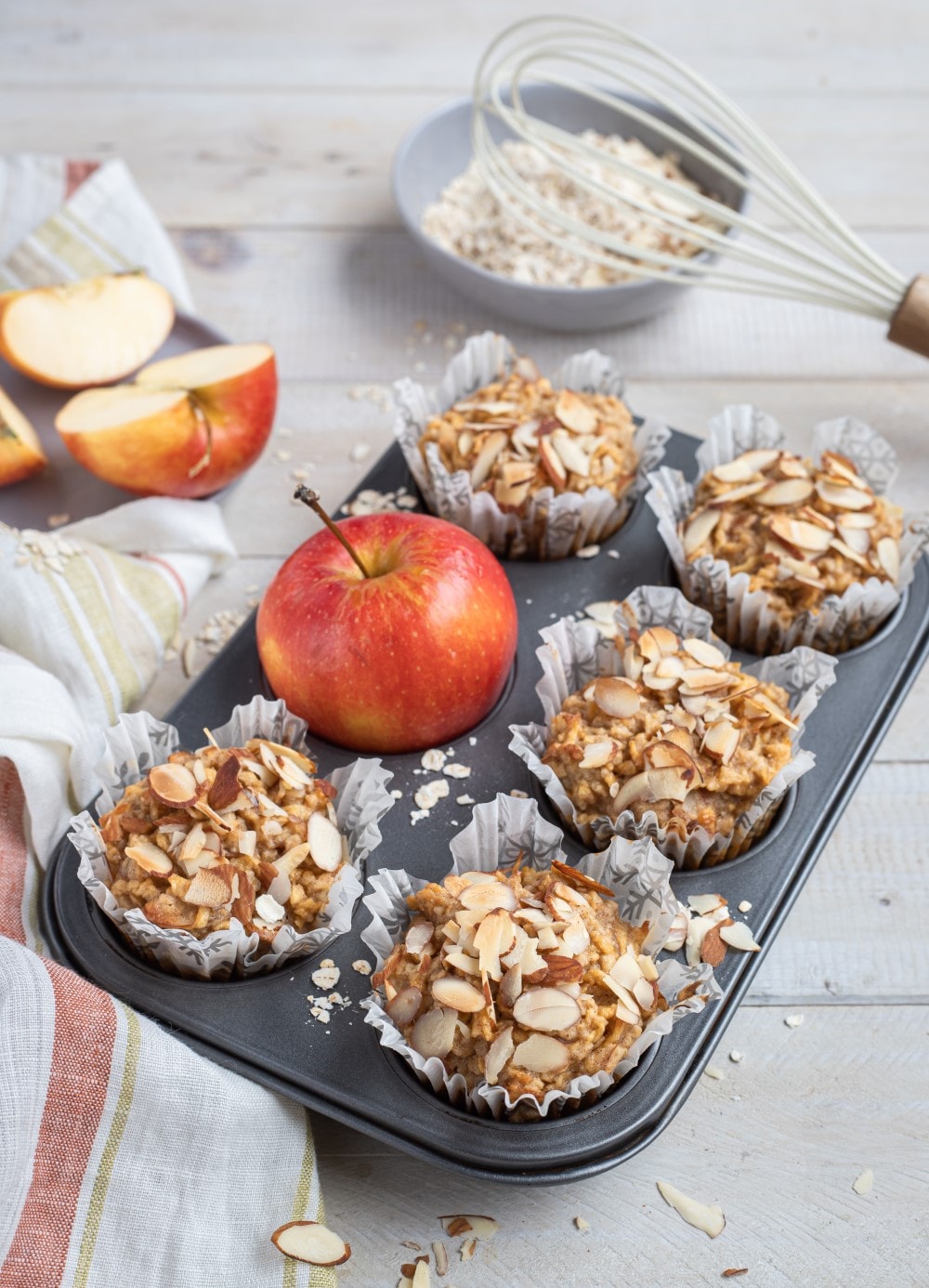 Mod de preparare: Pregătește o formă pentru brioșe cu 12 cupe de hârtie. Preîncălzește cuptorul la 180°C. Curăță merele de coajă, taie-le în patru, scoate miezul și apoi taie-le felii. Amestecă-le imediat cu sucul de lămâie și scorțișoara. Bate crema de brânză cu uleiul de rapiță, concentratul de suc de pere și oul într-un castron, până obții o pastă netedă. Amestecă făina, migdalele și praful de copt, apoi încorporează-le în aluatul cu brânză. Împarte aluatul în formele pregătite. Adaugă feliile de mere. Amestecă bine migdalele tocate, fulgii de ovăz și mierea. Întinde amestecul peste brioșe. Coace brioșele timp de 20-25 de minute, până când devin aurii.