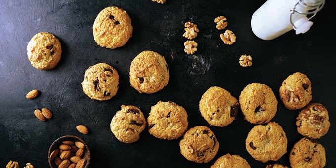 Dupa ce obtii un aluat omogen, pune-l la frigider timp de cel putin 30 de minute. Scoate-l cand consideri ca este suficient de rece si rupe bucati mici, pe care le poti modela si aplatiza dupa cum vrei. Acum poti adauga si bucati mici de nuci, migdale sau alune in compozitie.